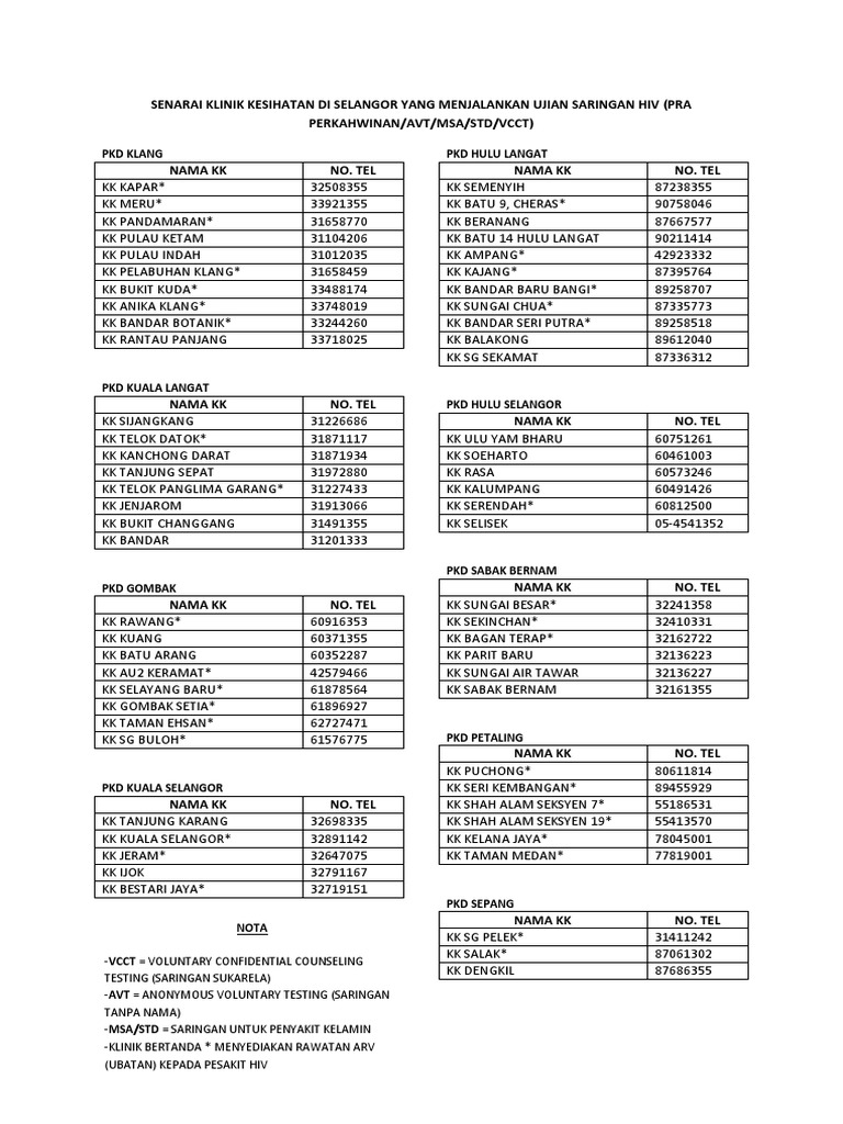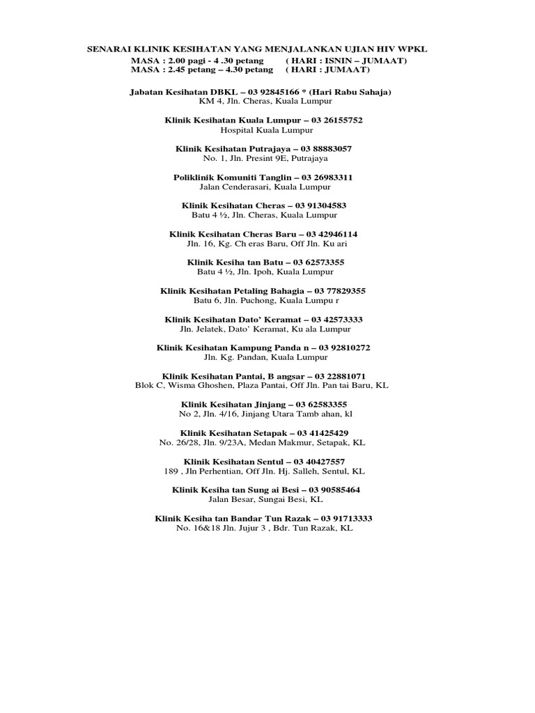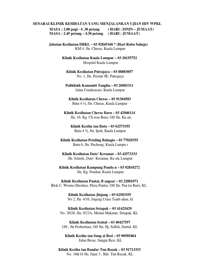 Senarai Klinik Kesihatan Yang Menjalankan Ujian Hiv Wpkl Pdf