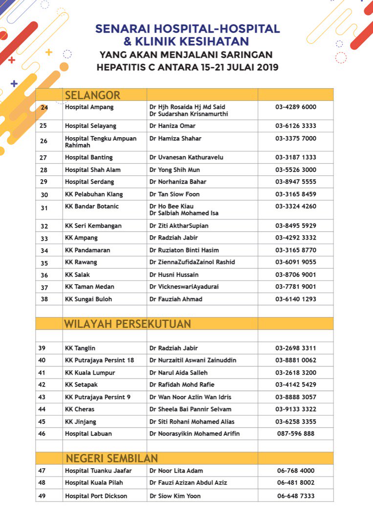 Kkmalaysia On Twitter Senarai Klinik Kesihatan Dan Hospital Kerajaan Yang Menjalankan Ujian Saringan Hepatitis C Pada 15 Jul 21 Jul 2019 Hubungi Pegawai Penyelaras Untuk Ketahui Tarikh Ujian Saringan Di Klinik Kesihatan